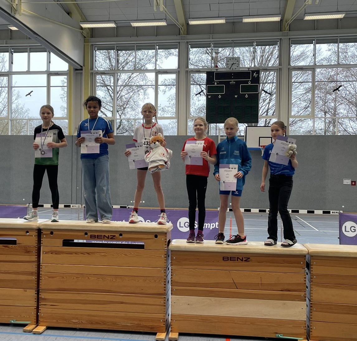 Besonders spannend verlief die Einzelwertung der Mädchen W11, bei der die Gesamtpunktzahlen der Plätze 1 bis 3 äußerst eng beieinanderlagen. Marie Büscher (SV Anzing) erreichte mit 1.533 Punkten einen starken 3. Platz. Hervorzuheben sind ihre Leistungen im Fünfsprung und im Stoßen, mit denen sie in beiden Disziplinen die stärksten Ergebnisse aller Athletinnen erzielte. Der Abstand zu den Plätzen 2 und 1 betrug lediglich drei bzw. sieben Punkte. Alina Alic (SG Poing) belegte mit 1.474 Punkten den 6. Platz, dicht gefolgt von Marie Geisberg, die mit 1.470 Punkten Rang 7 erreichte. In der Altersklasse W10 durfte sich Magdalena Köck (TV Markt Schwaben) mit 1.314 Punkten über einen sehr guten 3. Platz freuen.