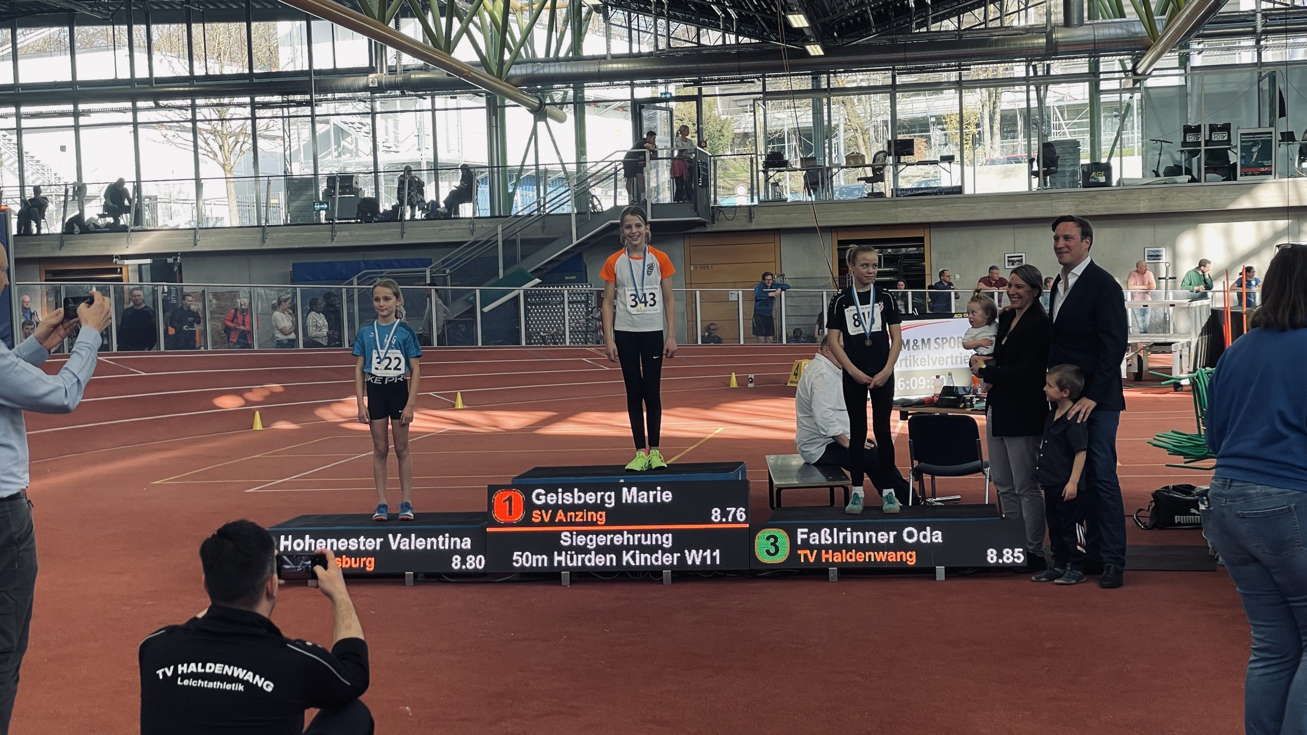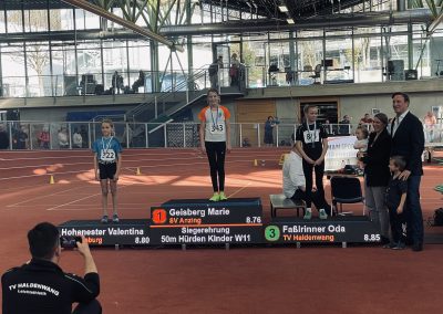 Für Marie Geisberg (W11) gab es Gold über die 50 Meter Hürden: Mit 8,76 Sekunden gewann sie souverän ihr Rennen. Noah Geisberg folgte in derselben Disziplin mit 9,13 Sekunden auf Platz 5.